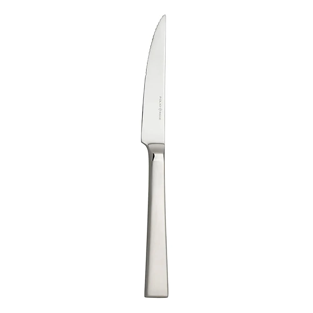 This 9-1/2″ steak knife is part of the Ridge Flatware Collection by Folio and features a classic design with a unique arch at the base of the tines and beautifully brushed satin finish handles.